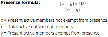 Prisutnost člana za određeno razdoblje izračunava se dijeljenjem njegovih ili njezinih akumuliranih bodova nazočnosti s brojem statutarnih sastanaka tijekom tog razdoblja.