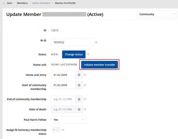 Premještaj inicira tajnik kluba pošiljatelja. Uloga Administrator članova ili Administrator (sva prava) je potrebna za ovu funkciju. Prelaz se pokreće tipkom POKRENI PRELAZ ČLANA na kartici Zajednica aktivnog člana.