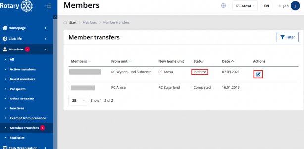 Sve dok je članov Prelaz u statusu "Prihvaćen", njegov korisnički račun je onemogućen i on/ona se ne može prijaviti. Obično se proces prelaza dovršava sljedeći dan i članov korisnički račun je omogućen u njegovom/njezinom novom klub. Imajte na umu da datum "NAPUSTIO MATIČNI KLUB dana" prethodi datumu " PRISTUPIO NOVOM KLUBU dana" za jedan dan. Preporučeno je da se razjasni transfer između dva tajnika klubova te da se pokrene transfer u prošlosti, a ne u budućnosti. To omogućuje dovršetak prelaza unutar 24 sata.