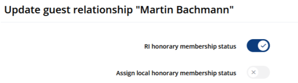 • Klub Rotarijanca koji će biti počašćen koristi Polaris i nalazi se u istoj instanci (zemlji) kao i klub koji dodjeljuje počasno članstvo . => Zatim rotarijanca učinite gostom u svom klubu i uredite njegov/njezin odnos. Ovdje mu/joj možete dodijeliti počasno članstvo RI. Pogledajte sliku.