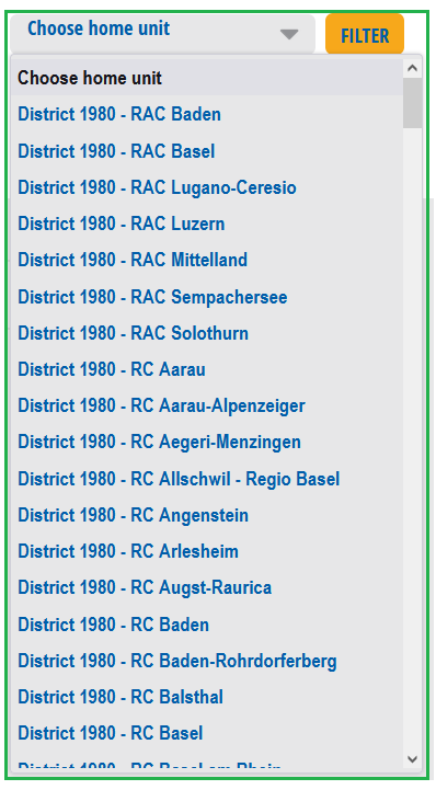 U trećem polju (označeno zeleno) možete odrediti u kojem klubu član treba biti. Možete odabrati samo jedan klub. Prema zadanim postavkama pretražuju se svi klubovi u zemlji.